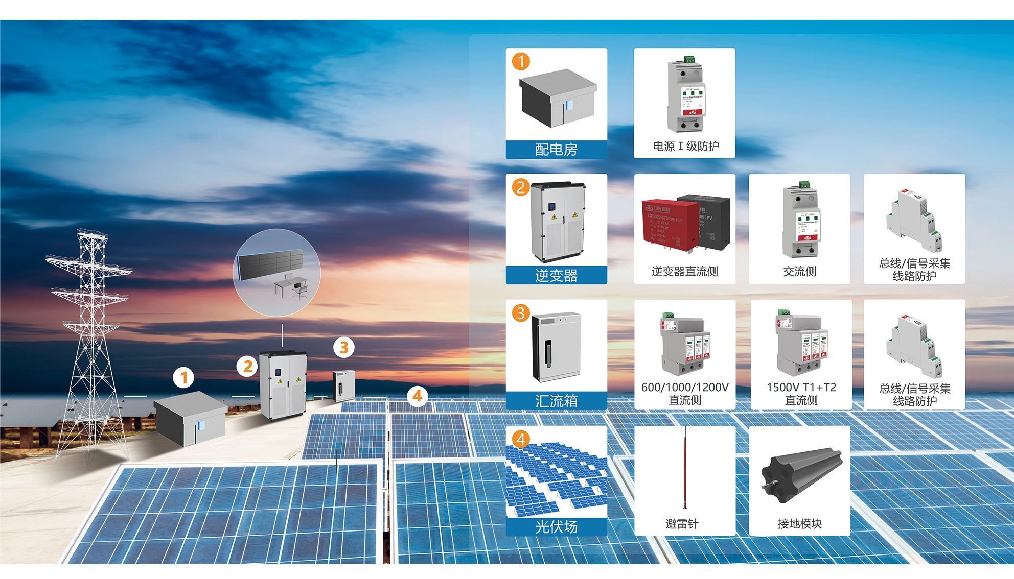中光針對光伏系統安裝面積較大,容易受到雷擊等特點(diǎn),提供了綜合防雷解決方案: