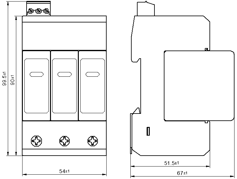 接線(xiàn)端子連接銅導線(xiàn)的截面積 | 多芯線(xiàn):1.5 mm2~25 mm2,單芯線(xiàn): 1.5 mm2~35 mm2 |
